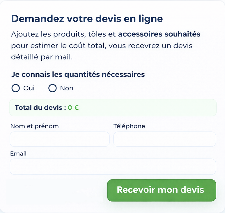 Sélectionnez vos produits, indiquez les quantités souhaitées et recevez immédiatement une estimation claire et détaillée.